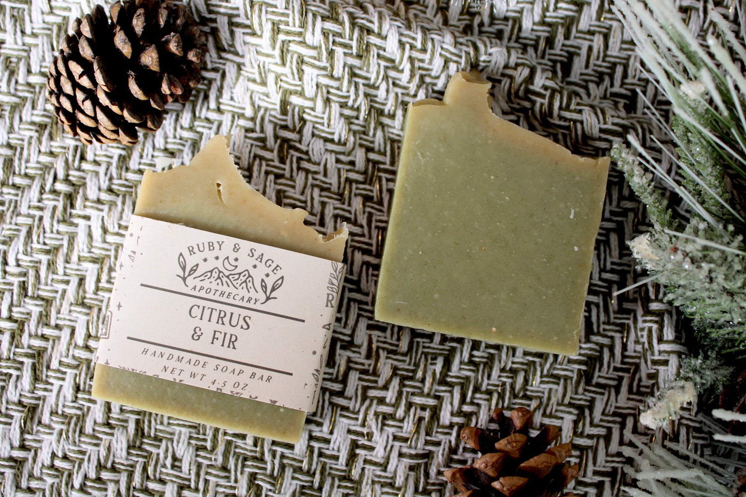 Citrus & Fir is a celebration in bar form—inspired by cabin gatherings where loved ones toast to gratitude and new beginnings. This thoughtfully crafted soap blends pine, fir needle, grapefruit, and spearmint essential oils to create a woodsy-citrus aroma that feels both grounding and uplifting. Infused with nourishing goat milk to soften and hydrate your skin, it's gently exfoliating with organic ground oats for a natural polish. More than just soap, it's an invitation to pause, reflect, and honor the moments—past and future—that matter most.